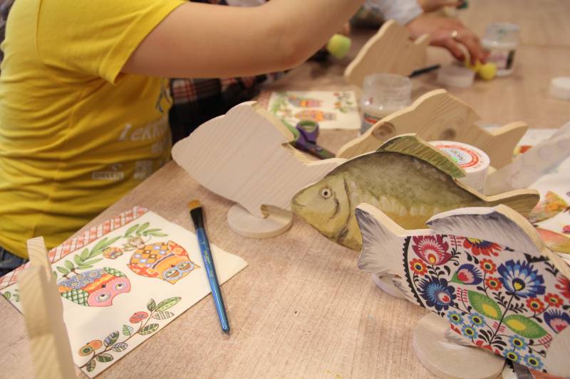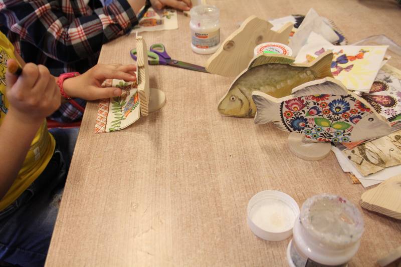 Warsztaty z ozdabiania drewnianego karpia odbywają się z profesjonalnymi instruktorami rękodzieła lokalnego. W trakcie warsztatów uczestnicy ozdabiają drewnianą sylwetkę karpia przy zastosowaniu różnych technik plastycznych np. decoupage, malowanie akrylami i konturami witrażowymi, dekorowanie elementów karpia filcem, tworzenie mozaik. Ozdobiony przez uczestników drewniany karp jest rezultatem warsztatów – pamiątką z Doliny Karpia, którą każdy z uczestników zabiera do domu.